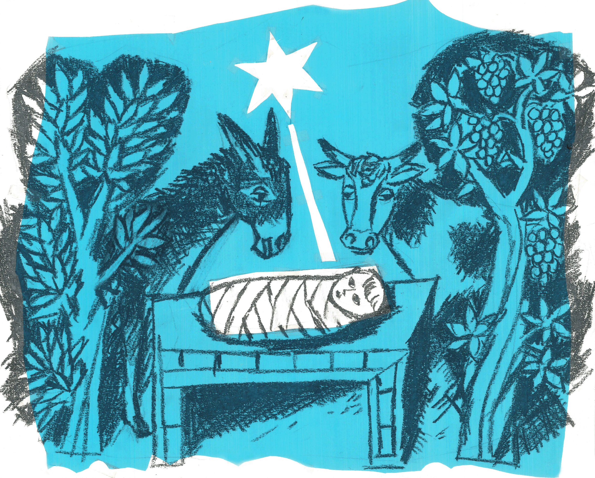 7 Weihnachtsbilder: Die Geburt Jesu / Engel verkünden den Hirten den Frieden / Ochs und Esel an der Krippe